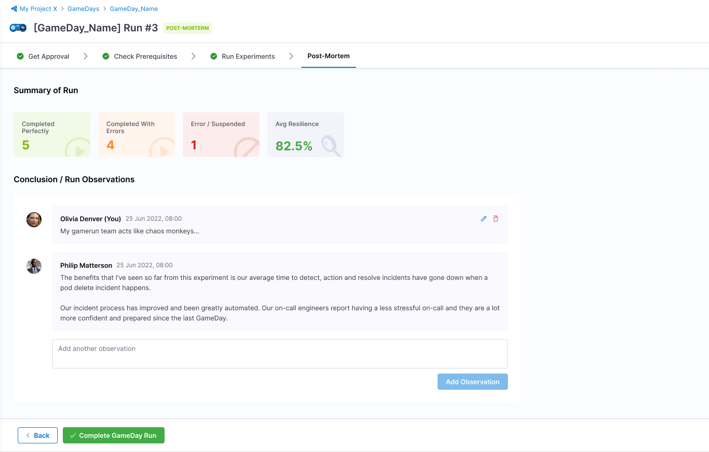 1. Once the experiments complete execution, select Complete GameDay Run. You can view the summary of the runs and the run observations.