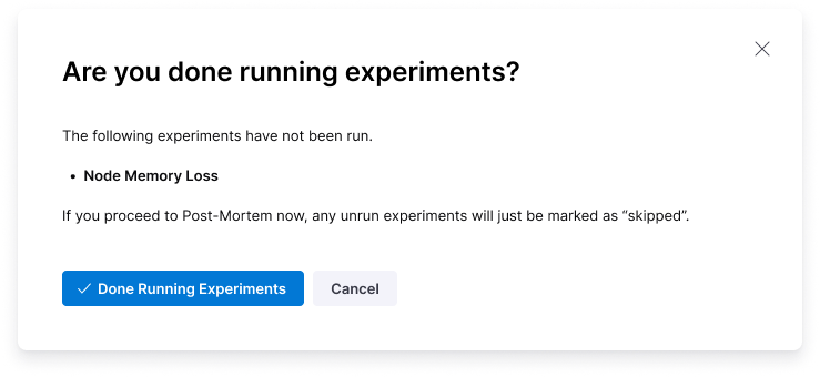 • Select Done Running Experiments to complete the run. If your chaos experiments have faults that have not run, they will be marked Skipped.