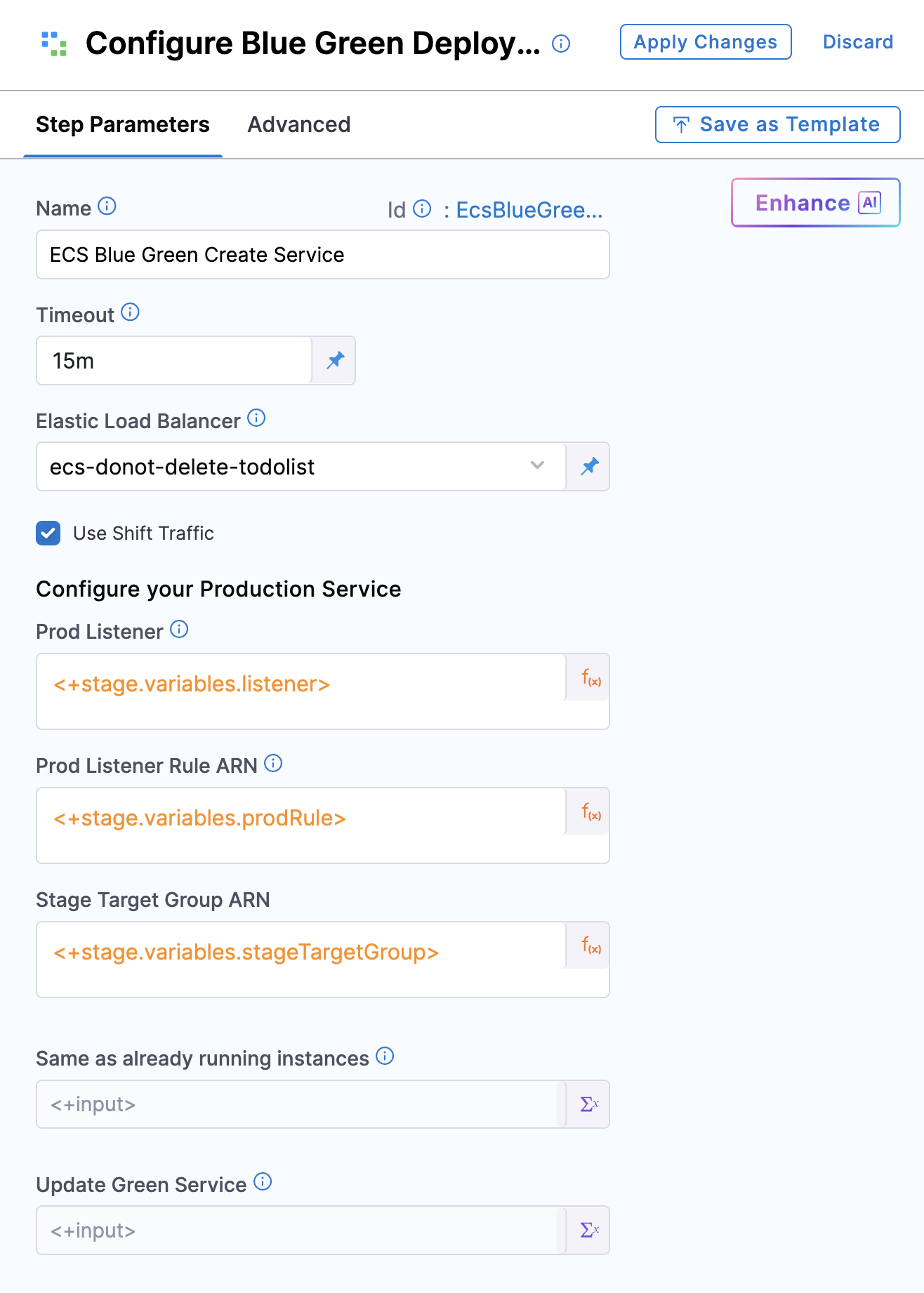 • Inherit the configuration from the previous ECS Blue-Green Create Service step using the Inherit checkbox, or