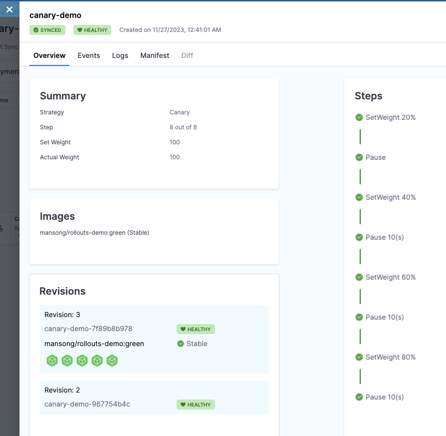 The demo rollout uses a basic canary strategy. View the rollout details: