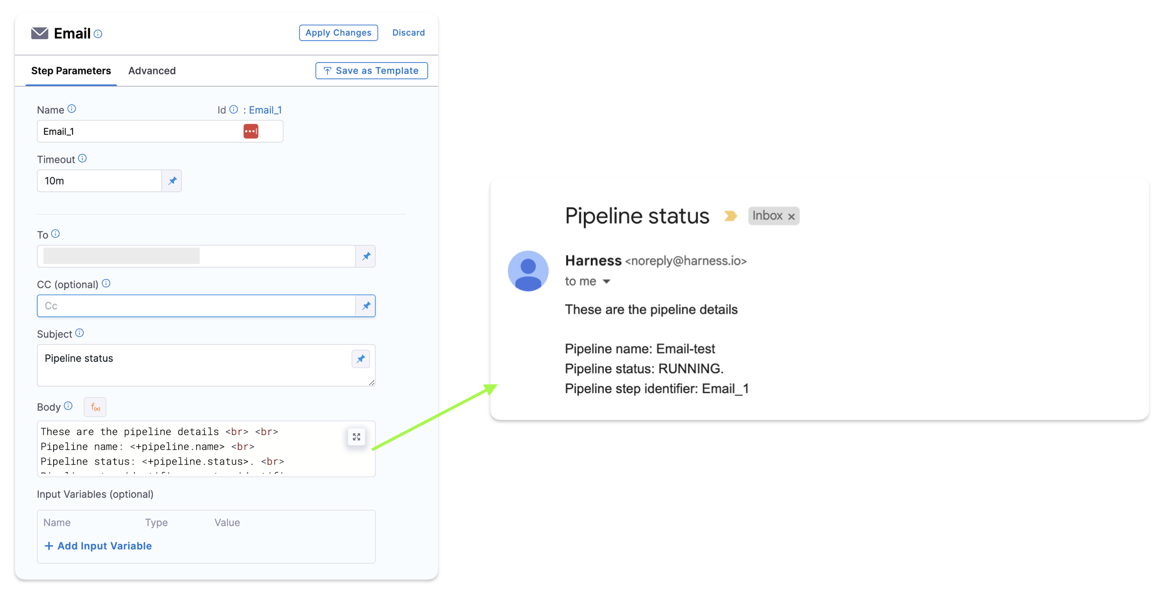 • Use input variables in the email step to customize the subject, body, and recipient list dynamically based on pipeline variables and context.
