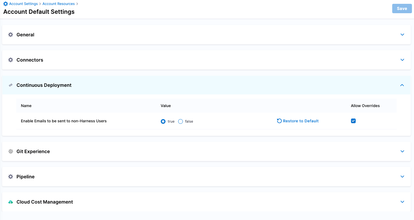 2. In Default Settings (at the account, organization, or project level), select Continuous Deployment, and then set Enable Emails to be sent to non-Harness Users to true.