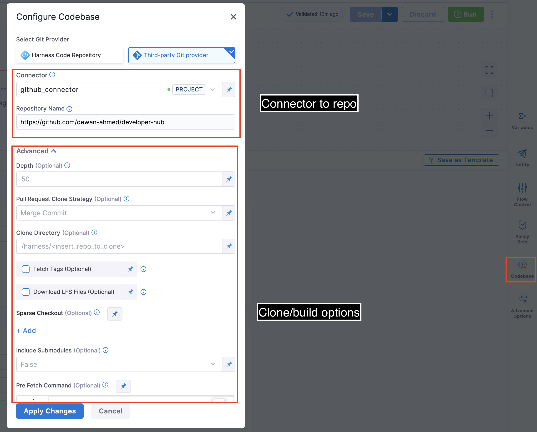 In addition to changing the Connector (connectorRef) or Repository Name (repoName), you can edit the following Advanced settings.