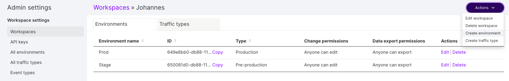 2. Click Create environment to add environments or click Edit on an environment to edit an existing one.