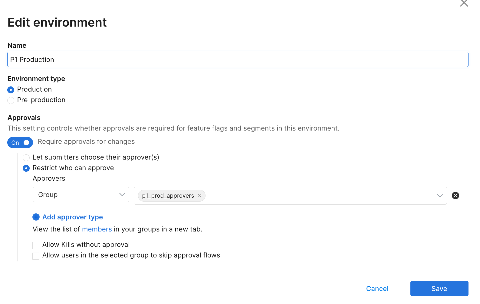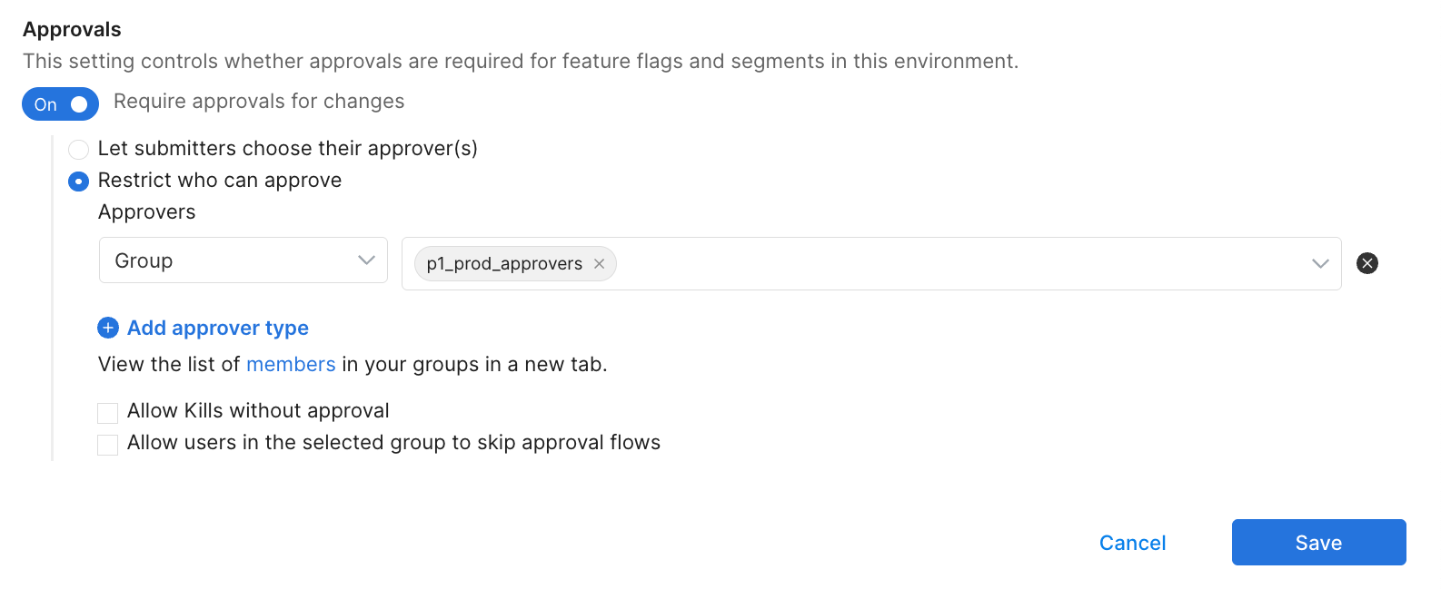 • Approvers: Select one or more user groups (for example, prod_approvers). To add additional approver groups, click + Add approver type.