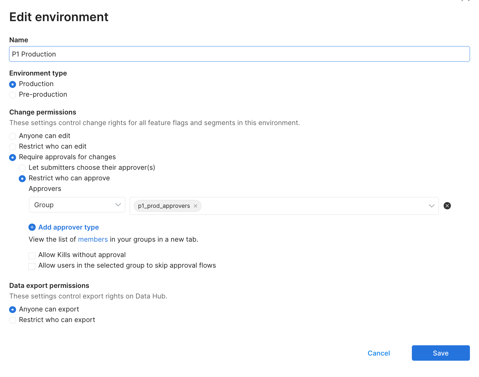 Edit and export permissions are enforced through RBAC Resource Groups and Roles. Approval requirements are configured at the environment level.
