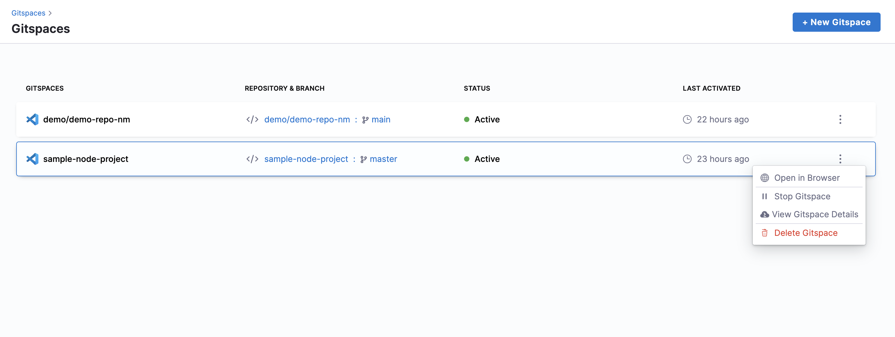 - Click on a stopped Gitspace and you’ll see the Start Gitspace button in the popup.