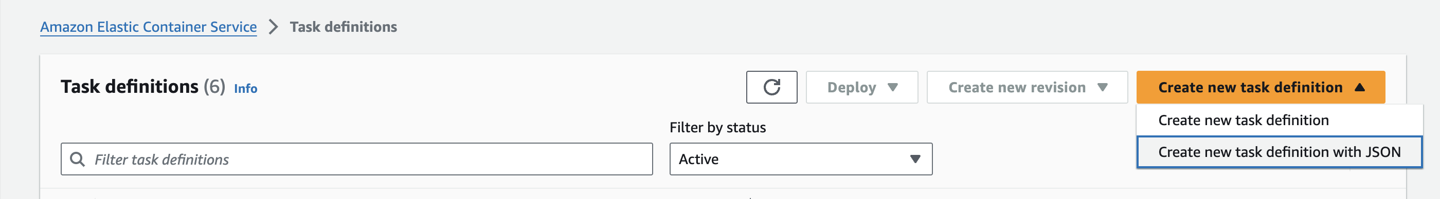 Use the following steps to create a task definition. For information about task definitions in Amazon ECS, go to Task definition template.