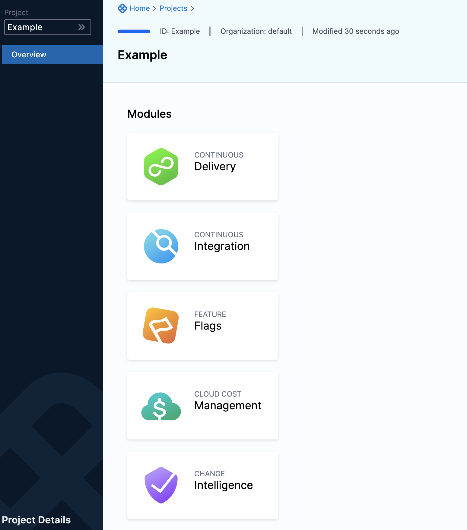 A Harness project is a group of Harness modules and their pipelines. For example, a project might have a Harness CI pipeline to build code and push an image to a repo and a Harness CD pipeline to pull and deploy that image to a cloud platform.