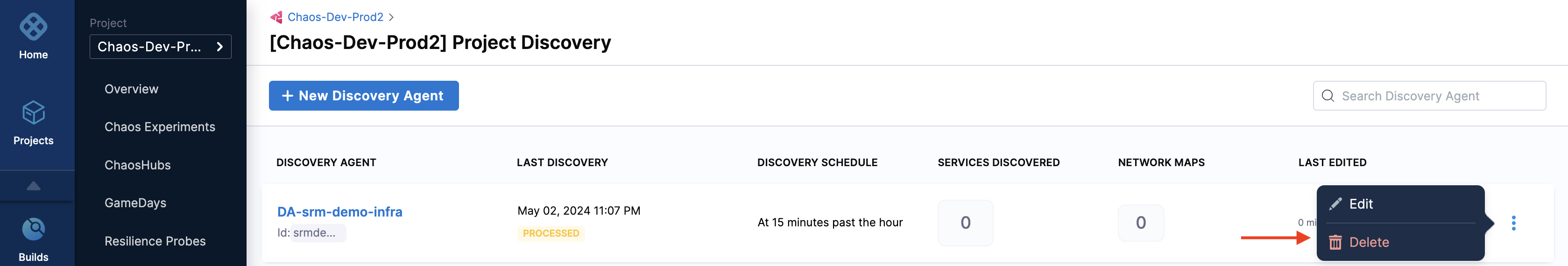 1. To delete a discovery agent, navigate to the agent you want to delete and select Delete.