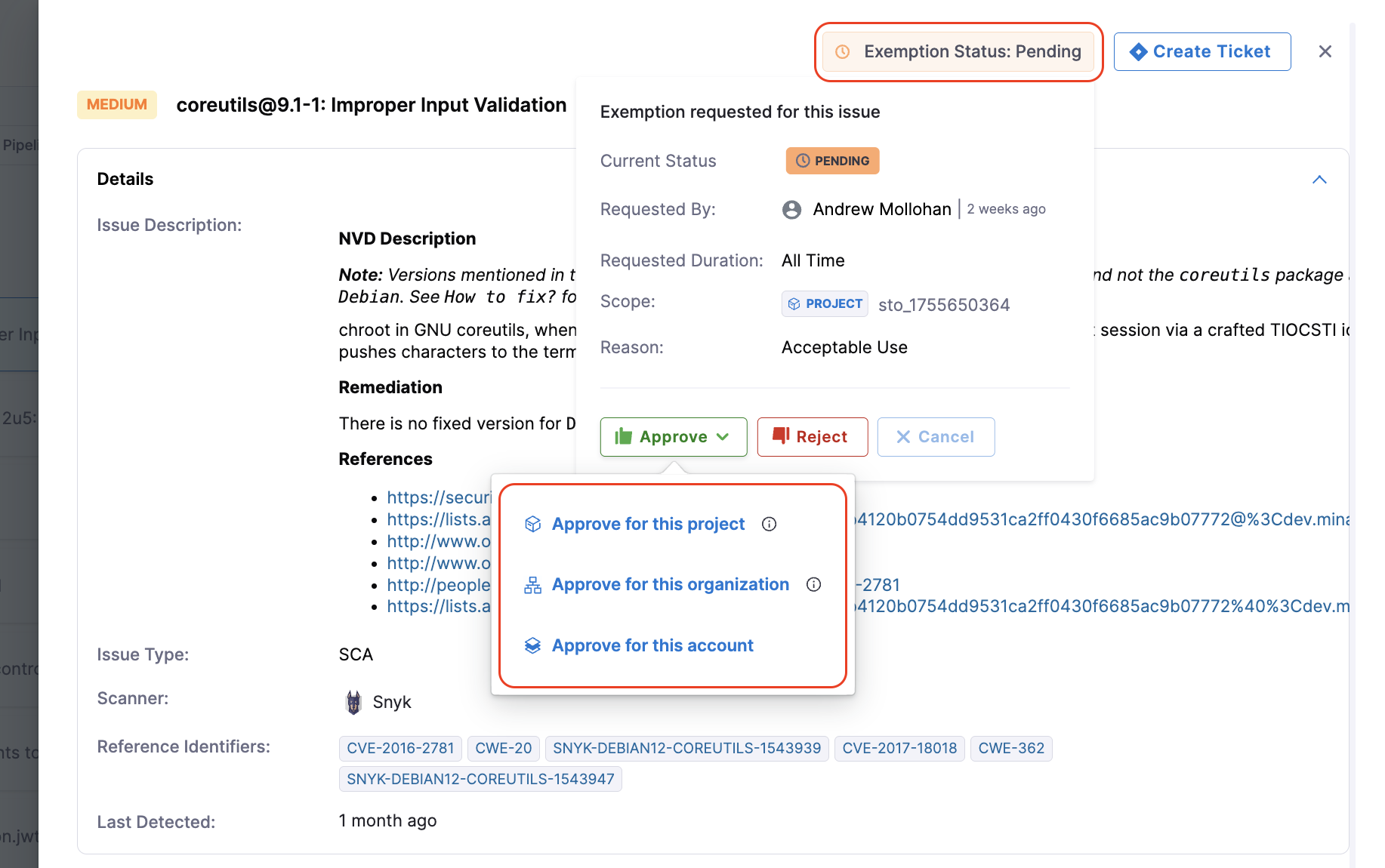 If an issue has an exemption status, the Exemption Status button will appear at the top of the pane. Here, you can click the button to view exemption details or take actions (Approve, Reject, Re-open) based on your permissions. Learn more in Issue Exemption Workflow.