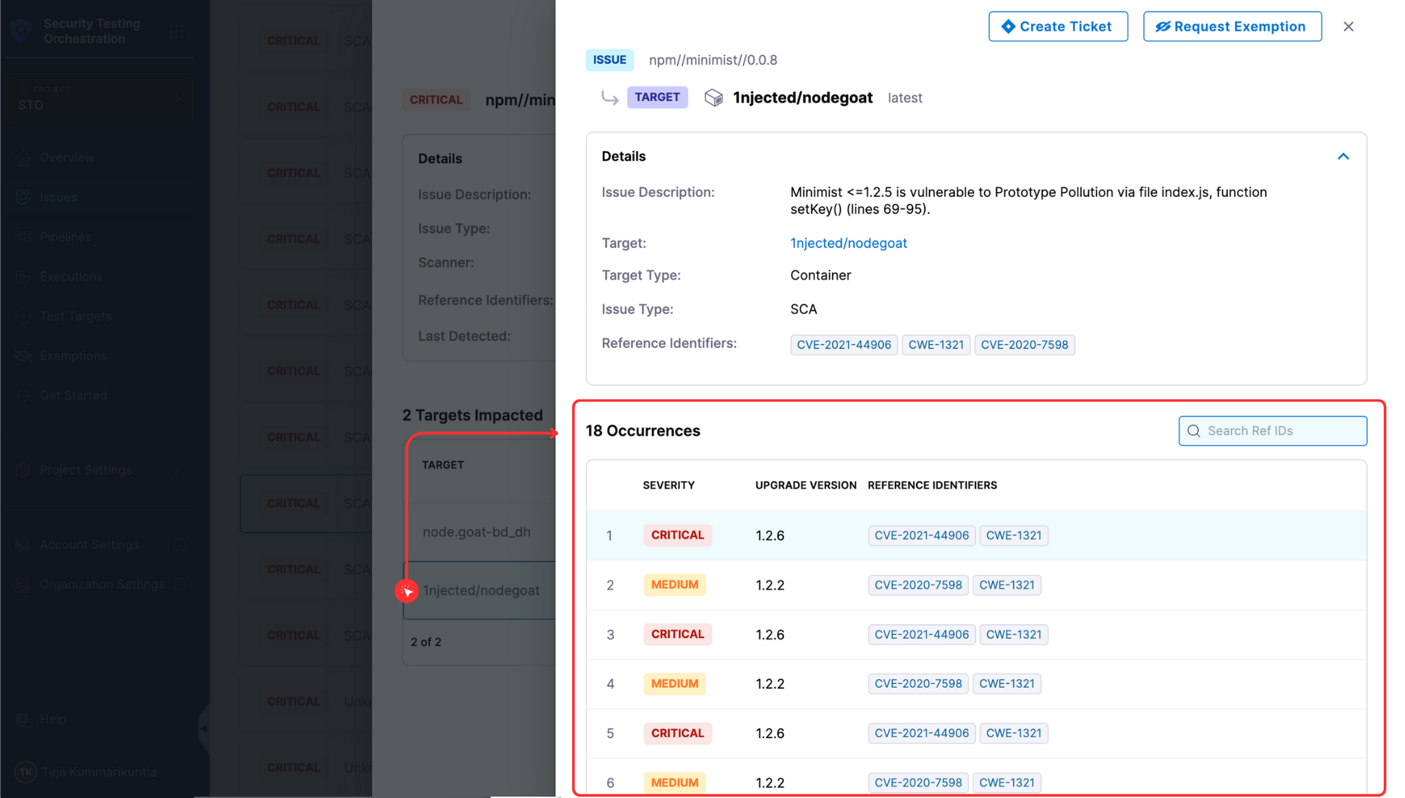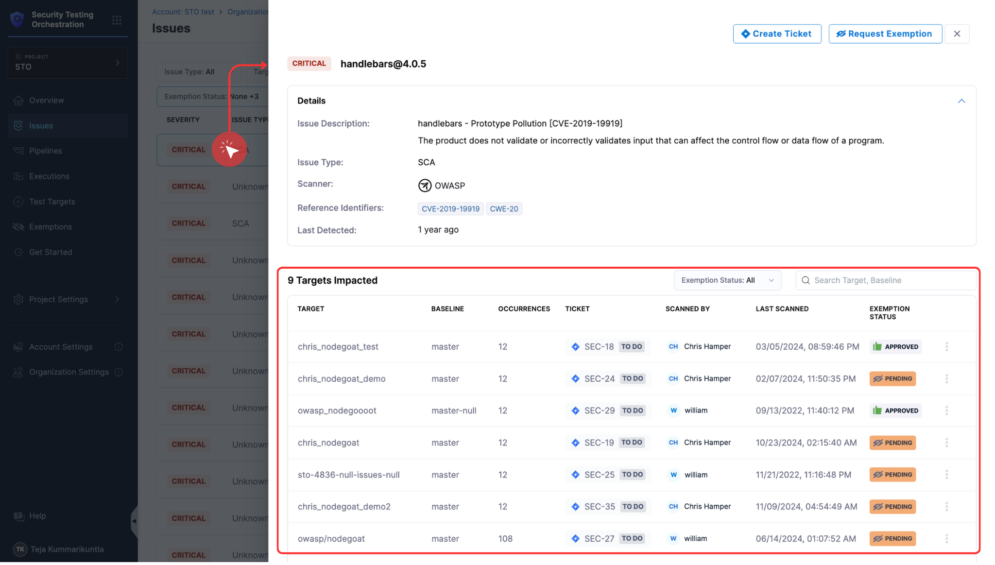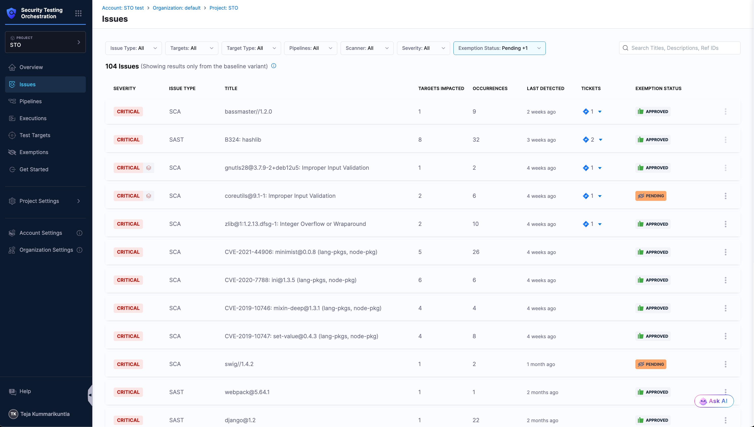 Access the Issues section from the left navigation in the STO module. You can apply filters to effectively navigate through the issues in your project. See Filters in Issues section for details.