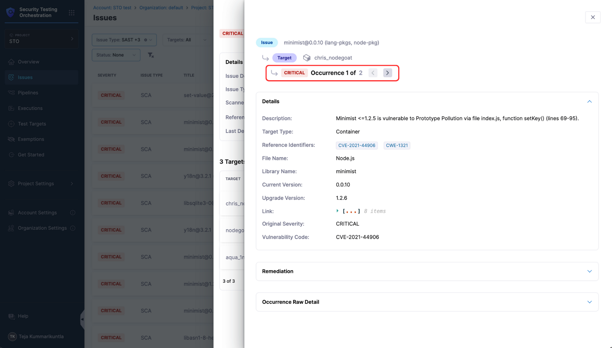 In the Target Details pane, you can explore individual occurrences from the latest baseline scan of the selected target and issue. Click an occurrence to open the Occurrence Details pane, which includes specific details, remediation recommendations, and raw occurrence data.