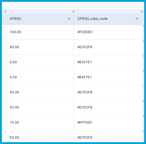 CFR percentage, add a column namedCFR percentage_color_code. -