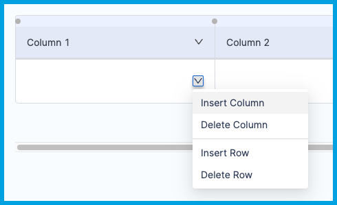 To add or remove rows and columns, select the Arrow in any non-header cell, and select Insert Column, Delete Column, Insert Row, or Delete Row.