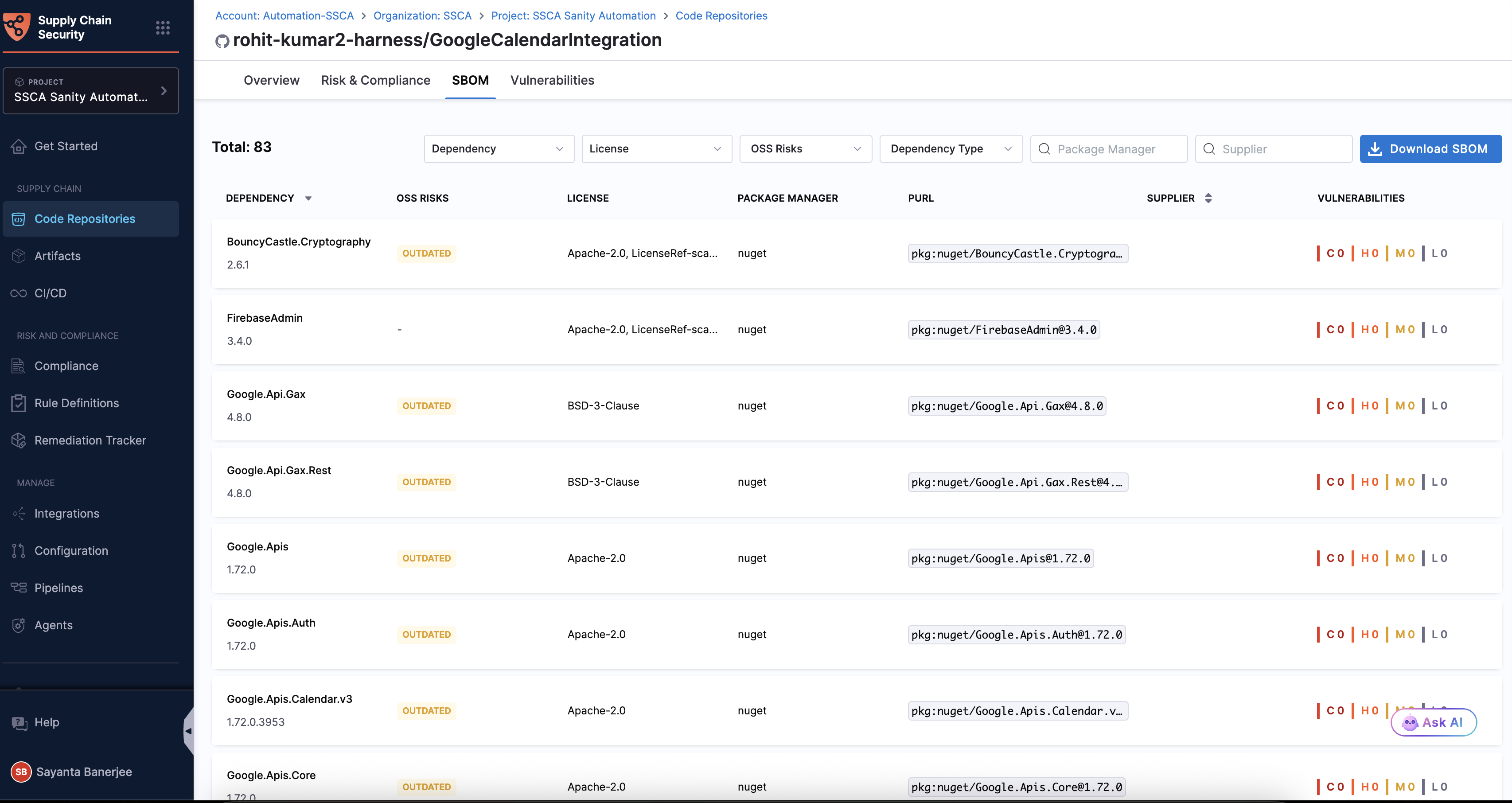 The SBOM section provides a comprehensive view of your repository’s dependencies. It includes a total dependency count and a detailed, searchable inventory. For each dependency, it surfaces key information such as name, version, OSS Risks, license, package manager, PURL (Package URL), supplier, and vulnerabilities.