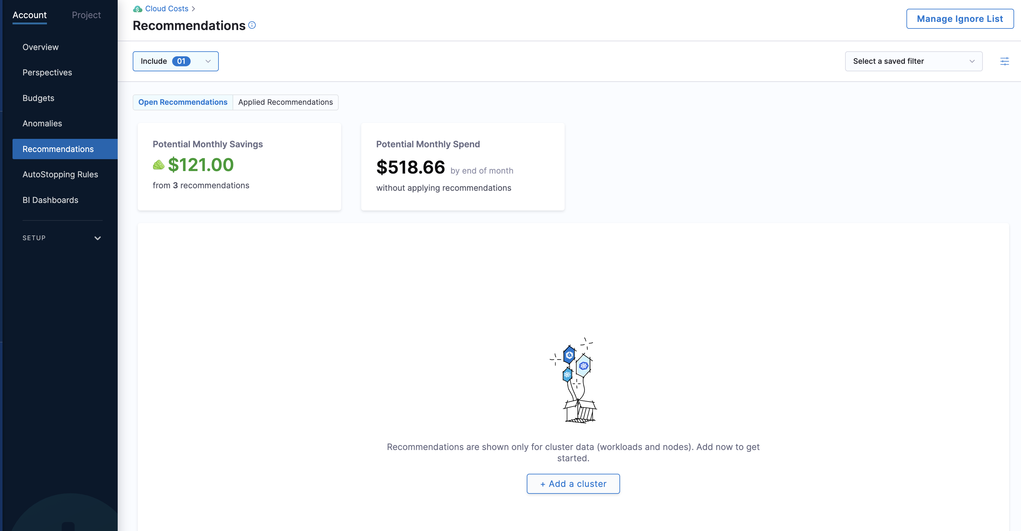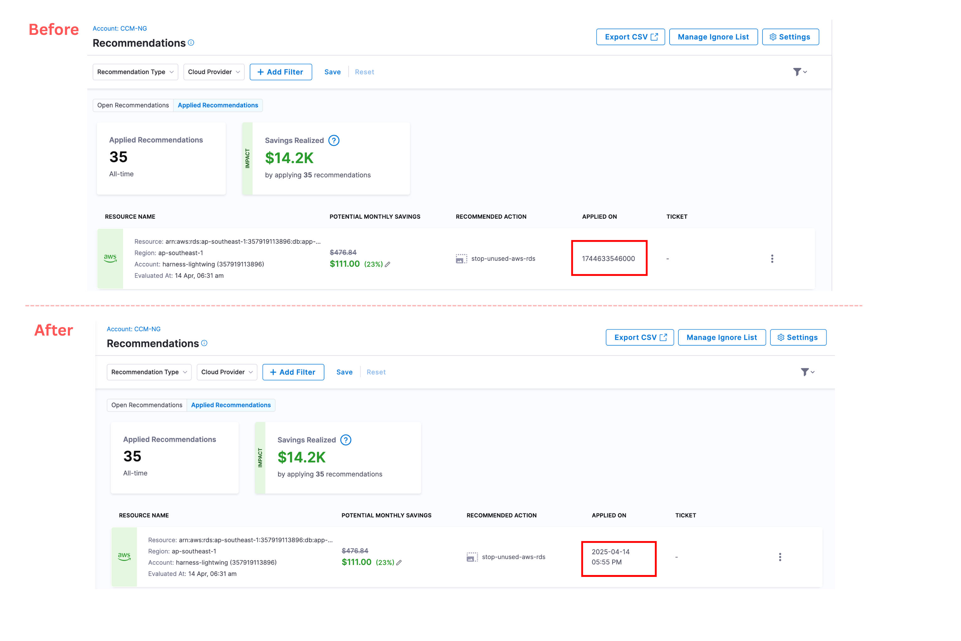 - Applied Recommendations Chart Aggregation: Improved the Recommendations vs. Savings chart to prevent clutter when large time ranges are selected. Aggregation now switches to monthly when the range exceeds three months and to yearly when it exceeds one year. [CCM-25390]