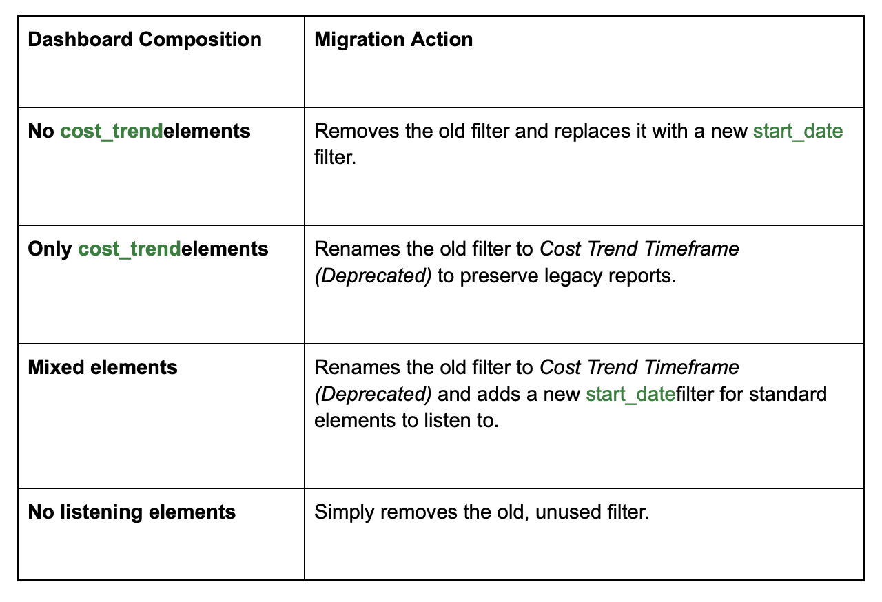 The technical detail: If an element uses legacy cost trend reporting, the script will automatically set the new start_date to 2x the original timeframe (or a default of 60 days). We do this intentionally to ensure Looker pulls enough historical data to calculate your period-over-period trends accurately.