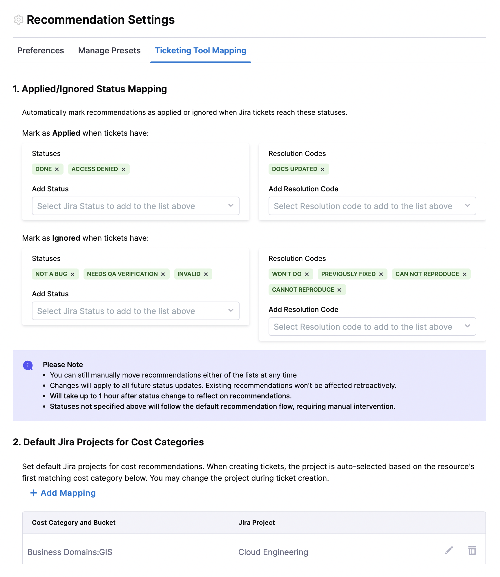 Cost Category–JIRA Mapping Cleanup: Empty rows will no longer be added when users attempt to create multiple mappings without saving them. [CCM-29161]